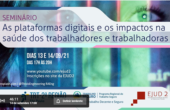 A Comissão do Trabalho Decente aprofunda o tema “As plataformas digitais e os impactos na saúde dos trabalhadores e trabalhadoras” nesta segunda (13) e terça (14). Sempre com início às 17 horas, através do canal do Youtube, os Entregadores serão orientados sobre direitos neste momento de tanta precarização. O Ministério Público do Trabalho (MPT) ministrará duas palestras no seminário no dia 13: “Terceirização no ensino e plataformas digitais” (19 horas) e “A atuação sindical e o trabalho em aplicativos” (19h30).